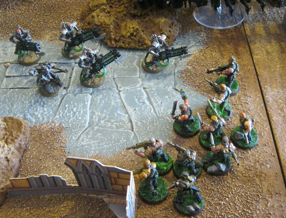Llegan los vehículos voladores cargados con inmortales desde la reserva. Las plataformas siguen con su movimiento de flanqueo y las arcas se preparan para hacer otra descarga de disparos sobre los imperiales. El Acechante se adelanta por el centro sobre los guardia imperiales.Los disparos aniquilan una la unidad de Veteranos que se había acercado para intentar ayudar a abatir una de las arcas. Sus otros disparos matan unos cuantos marines dejando una de las unidad muy diezmada.